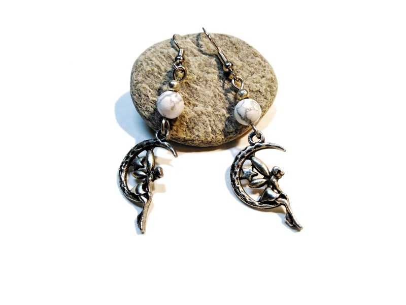 Silver or Golden lever back Earrings, Fairy and Moon & Howlite pendants